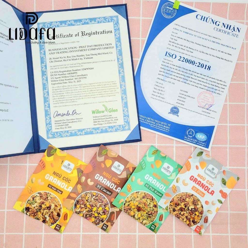 - Nguyên liệu: Yến mạch, hạt điều, óc chó, mắc ca, hạnh nhân, hạt bí, nho, nam việt quốc, xoài, mật ong, dừa khô sấy, bột cacao, bột trà xanh
